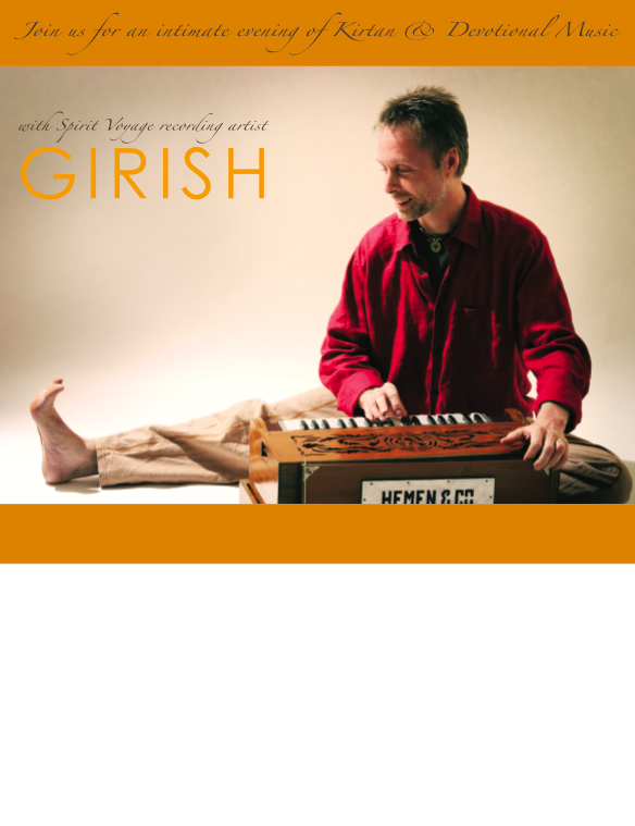 Girish, an accomplished musician of many genres, former monk infused in spiritual practice, loving wordsmith linking lyrics and rhythm in a blissful musical event, sings traditional Sanskrit mantras with a modern, funky, yet deeply devotional twist. Accompanied by his amazing band, Girish invites his audience at his kirtan concert to participate by singing along, call and response chanting, and dancing. Girish has been recommended and featured in "O, The Oprah Magazine", "Yoga Journal" "Spirituality and Health Magazine", "LA Yoga Magazine", "Common Ground" and "Yogi Times." Girish's original music catalog of seven albums is popular in yoga studios and music festivals all over the world, and his "Mantras and Music" book will be published by Simon and Schuster in January 2016.